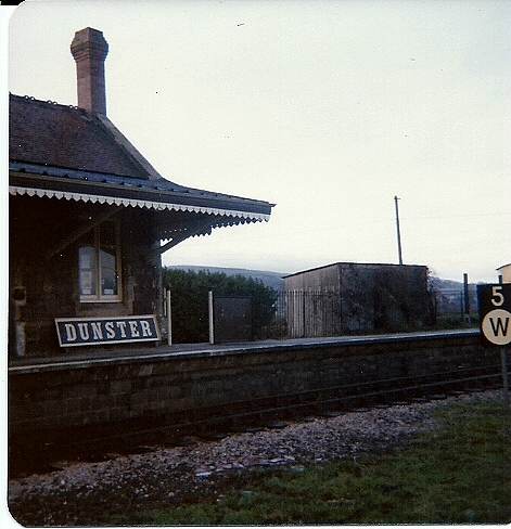 December 1976 Dunster station sign rests against the station building. |