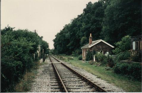 The relative position of the station platform (beyond the wooden shelter on the left) and the station building. |